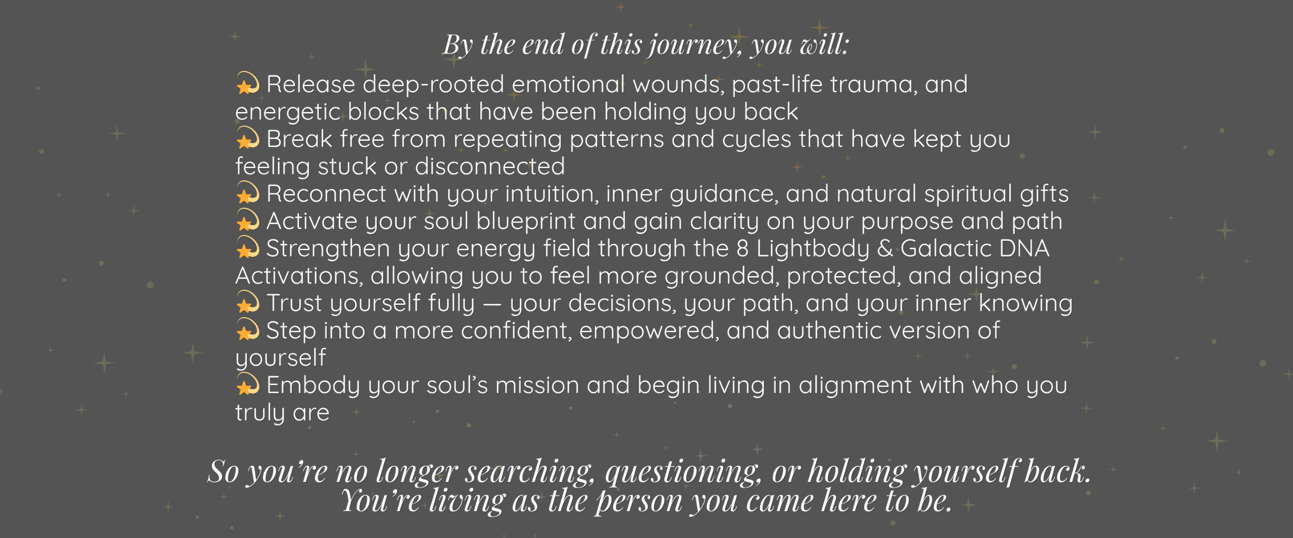 Using powerful healing work and channelled Galactic DNA & Lightbody Activations, you’ll release old timelines, reconnect with your gifts, and align with your soul’s true mission. This is a 12-week initiation into your highest timeline, soul mission and true power so you can step into the role of a lightworker who trusts themselves enough to stop holding back and step fully into their soul's path💫